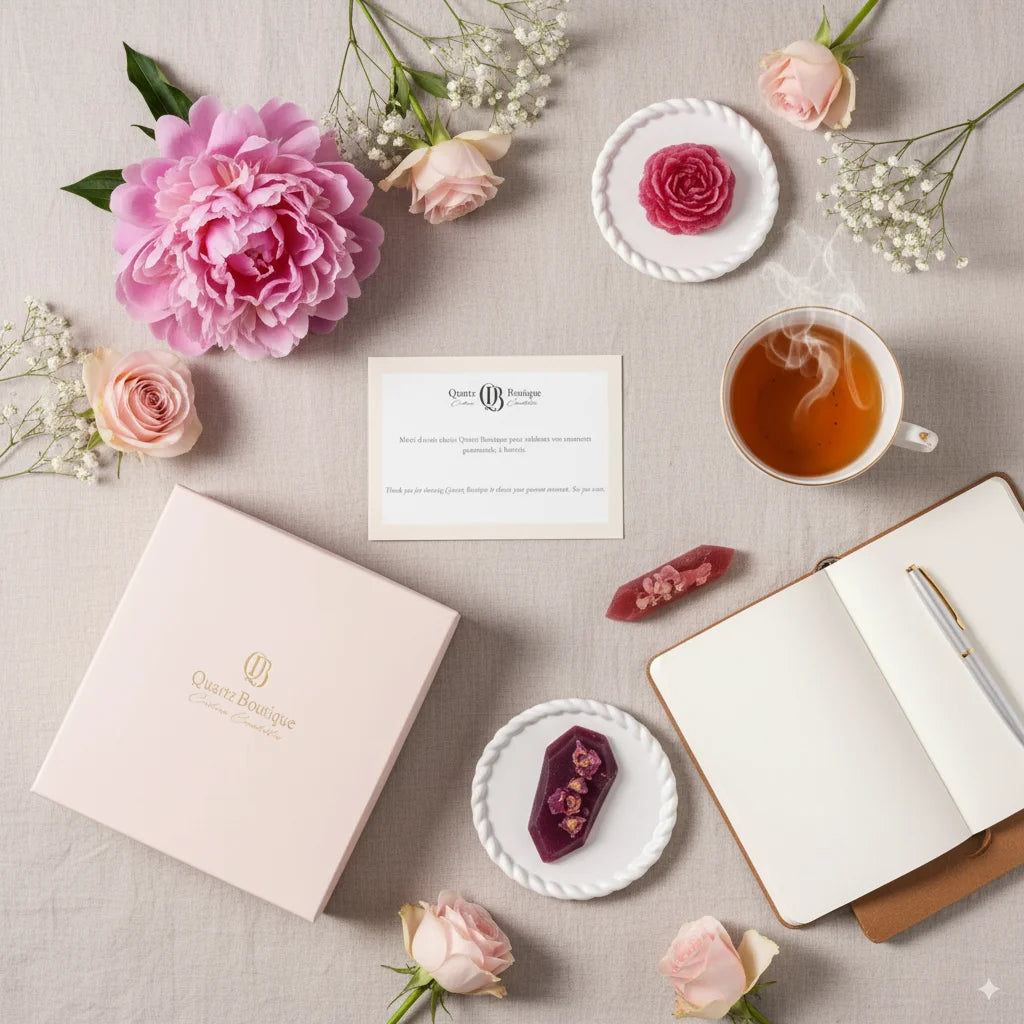Plongez dans l’univers mystérieux de Quartz Boutique avec nos Écrins Secrets. Chaque écrin renferme un cristal comestible unique, choisi aléatoirement parmi nos créations les plus raffinées. Un parfum inattendu, une découverte à chaque dégustation… parce que la magie réside aussi dans la surprise.