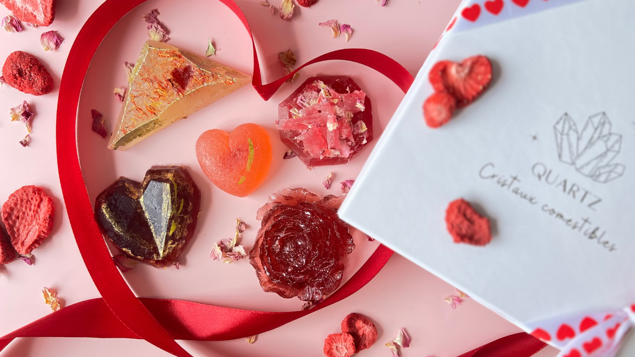 De eetbare kristallen hebben een gelatineuze textuur binnen, maar met een frisse buitenkant vanwege de kristallisatie van suiker.