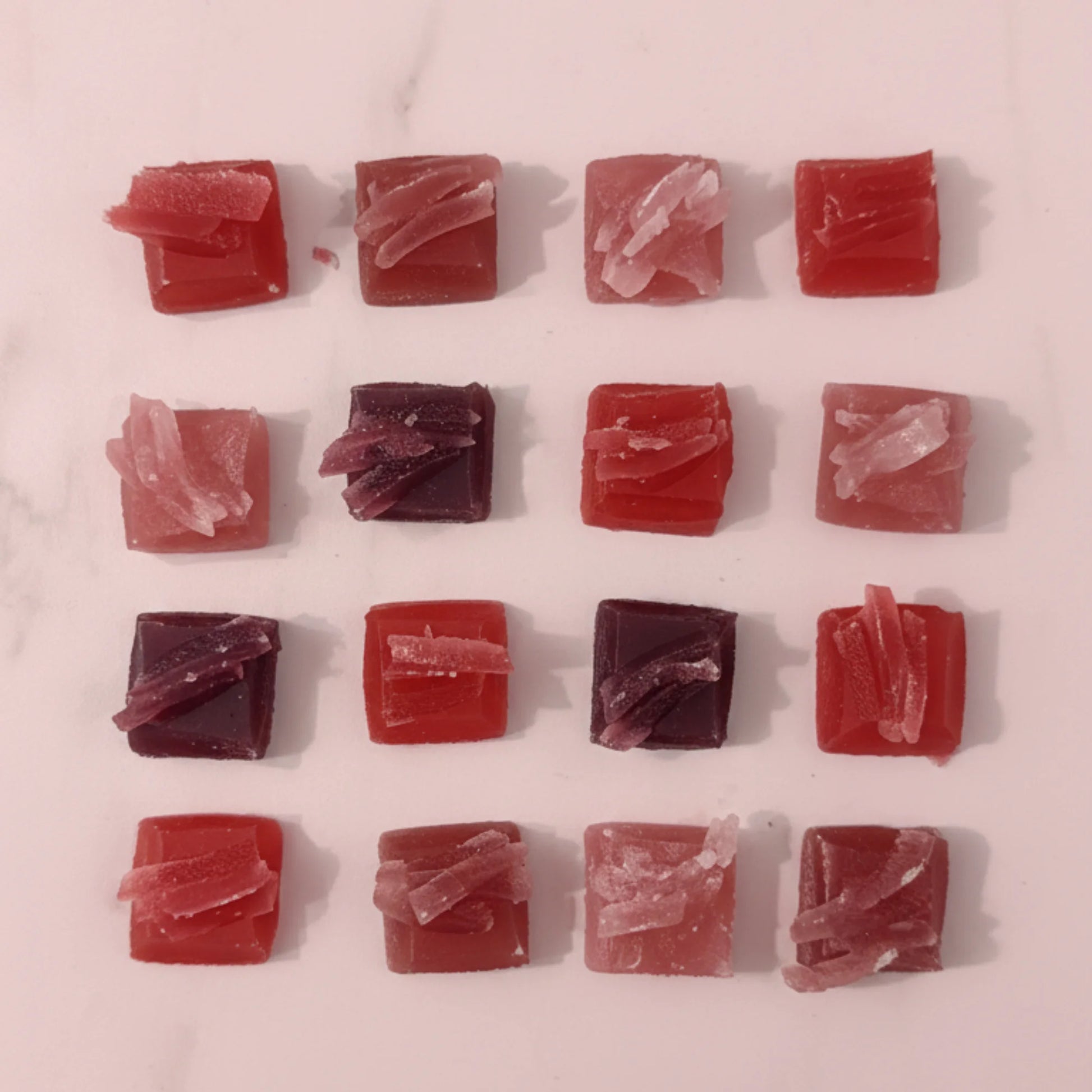 Un écrin délicat renfermant seize cristaux comestibles aux nuances fruitées et précieuses.