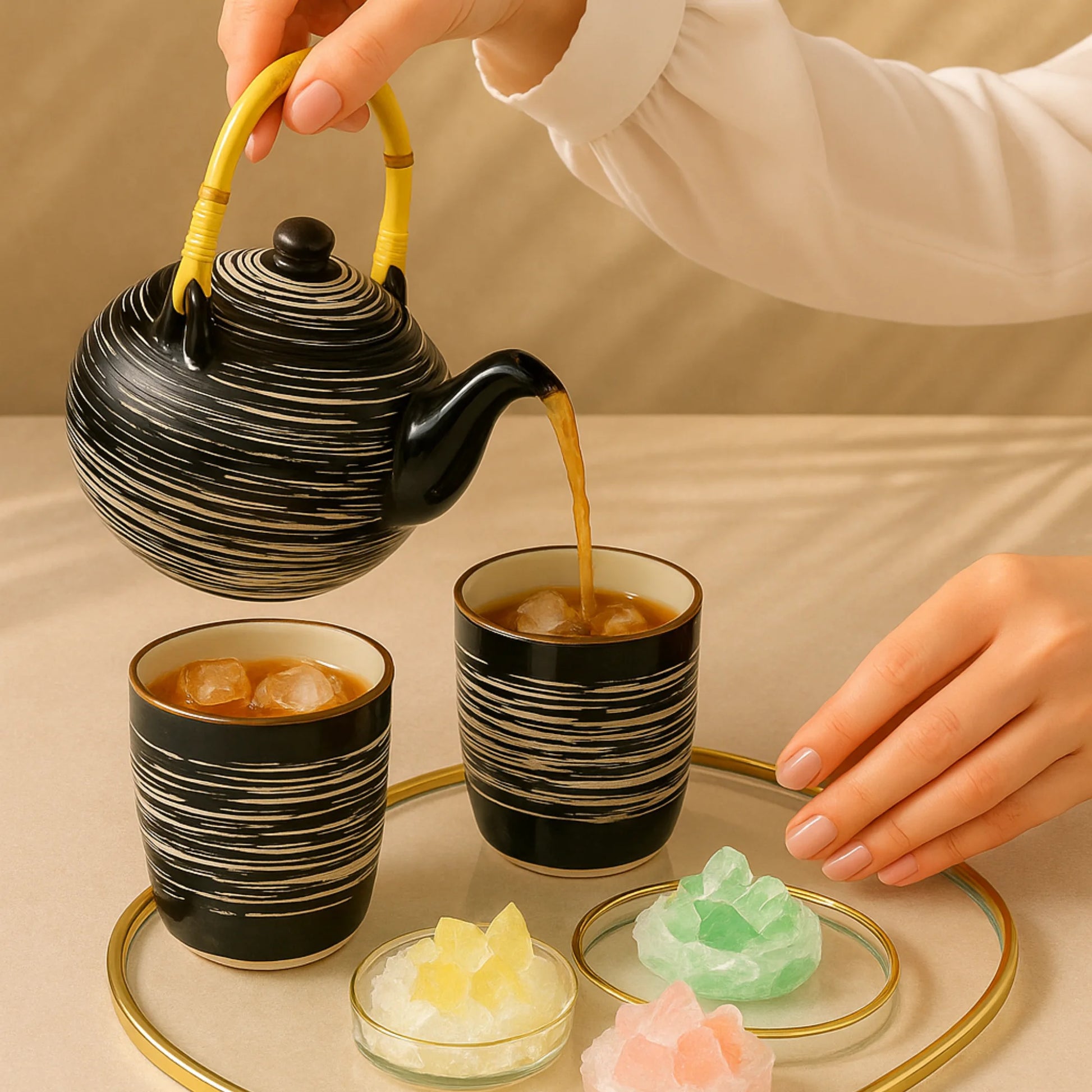 Een verfijnd moment waarop eetbare thee en kristallen elkaar ontmoeten voor een uitzonderlijk proeverij.